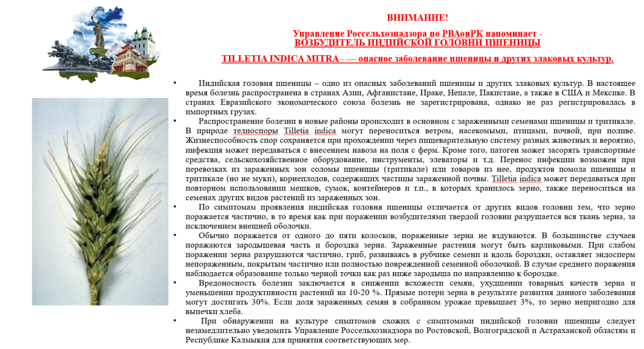 Управление Россельхознадзора по РВАОиРК напоминает — ВОЗБУДИТЕЛЬ ИНДИЙСКОЙ ГОЛОВНИ ПШЕНИЦЫ TILLETIA INDICA MITRA — опасное заболевание пшеницы и других злаковых культур.